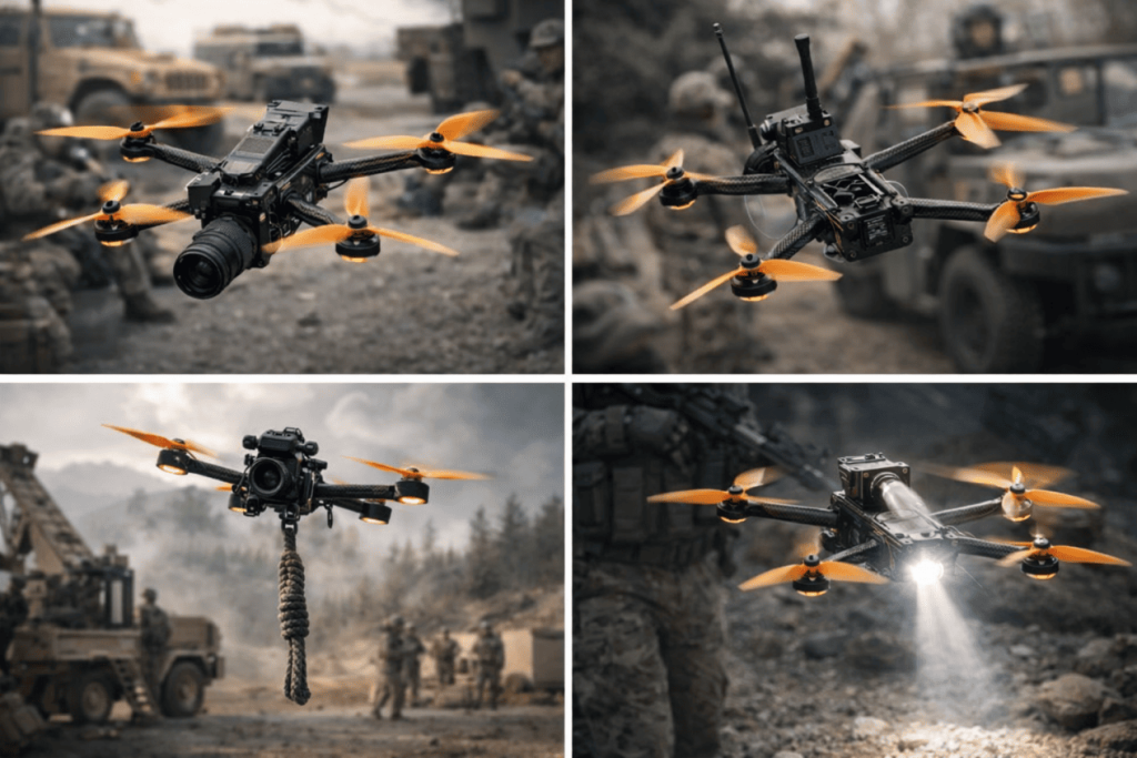 Designed as a First Person View (FPV) drone, the multirotor UAV delivers ultra-low latency video transmission, allowing operators to control the UAV in real time with high precision. Compared to traditional UAVs, FPV control enables faster decision-making, accurate navigation through urban combat, confined spaces, and complex environment where responsiveness and situational awareness are critical.