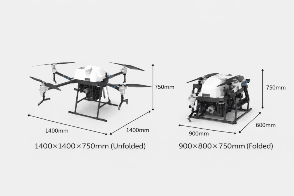 The multirotor drone is built with a modular design, making it incredibly easy to repair and maintain. It enables farmers to maintain productivity even during unexpected issues. Weighing only 55kg with a compact size (1400x1400x750mm unfolded), the hybrid quadcopter drone is easy to transport and maneuver. Its lightweight build and foldable design allow for quick setup and easy storage, ideal for farms of all sizes and reducing the logistical burden on users.