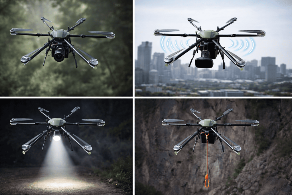 In military and tactical operations, carrying the right equipment directly affects mission efficiency. With a payload capacity of up to 25kg, the tactical hexacopter drone can support cameras, loudspeakers, lighting devices, dropping tools, and rescue ropes in a single platform. This allows teams to complete reconnaissance support, warning broadcasts, night search operations, emergency supply delivery, and rescue assistance.