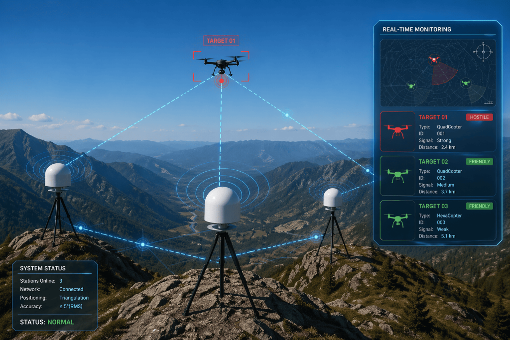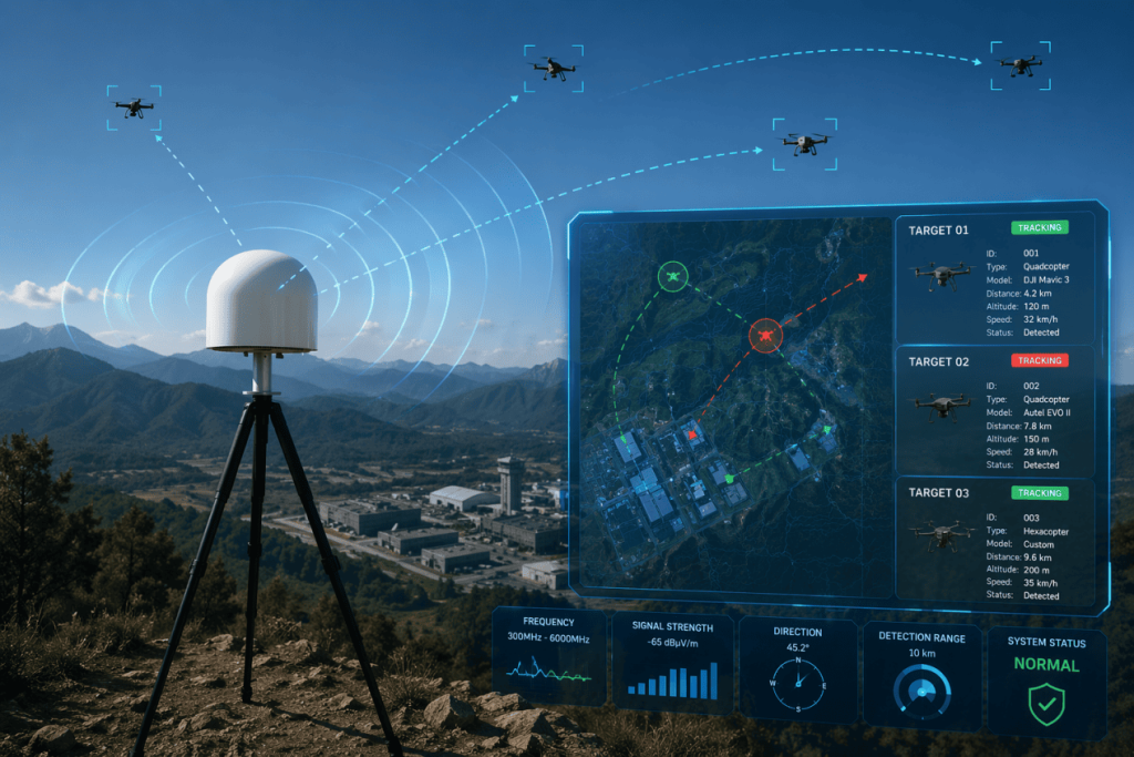 Designed with passive detection technology, the RF drone detection system operates without emitting signals, ensuring zero electromagnetic interference and high operational security. Its modular architecture allows for quick installation and flexible deployment across different terrains and mission requirements, making it ideal for both fixed and temporary surveillance setups in complex environments.