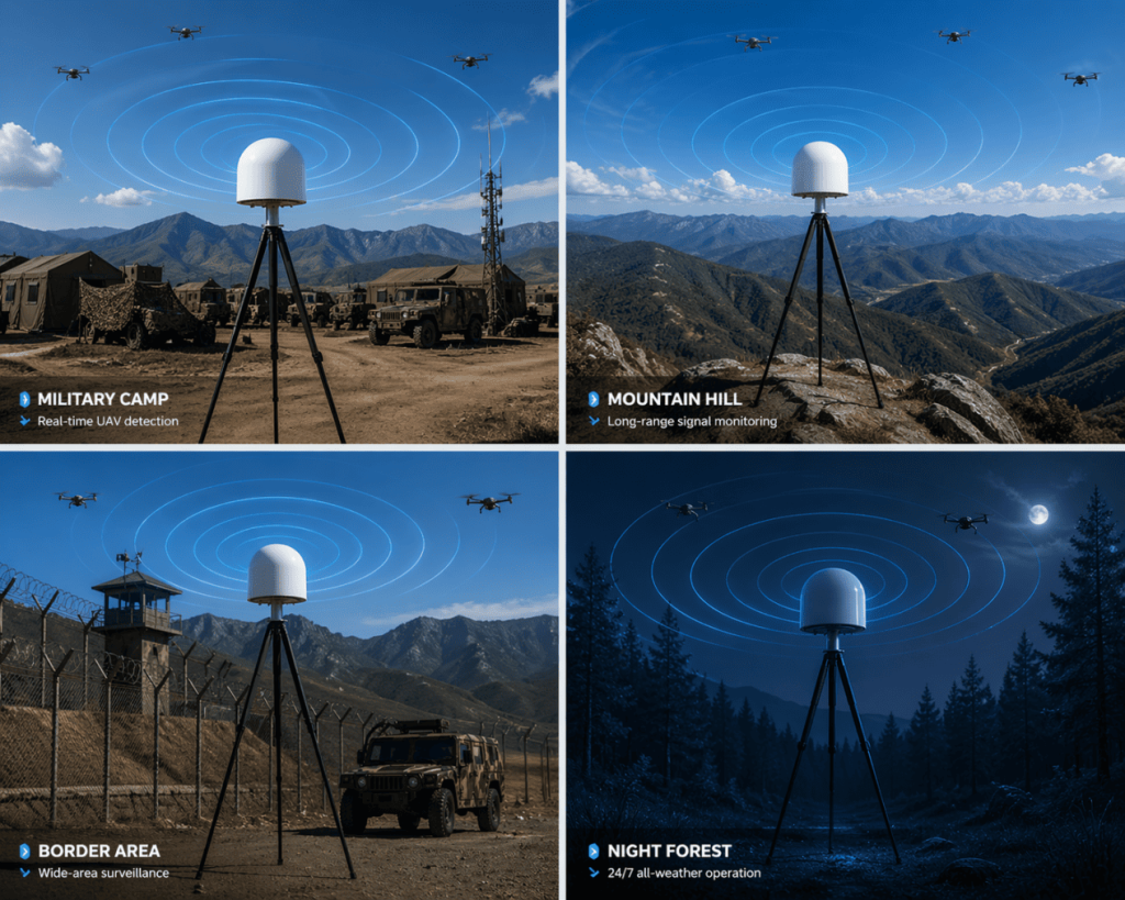 The RF monitoring equipment delivers reliable, real-time UAV signal detection and tracking in complex electromagnetic environments, making it ideal for military bases, border security, and critical infrastructure protection. Its passive monitoring, precise direction finding, and multi-station networking enable fast threat identification, improved situational awareness, and enhanced operational security without signal interference.